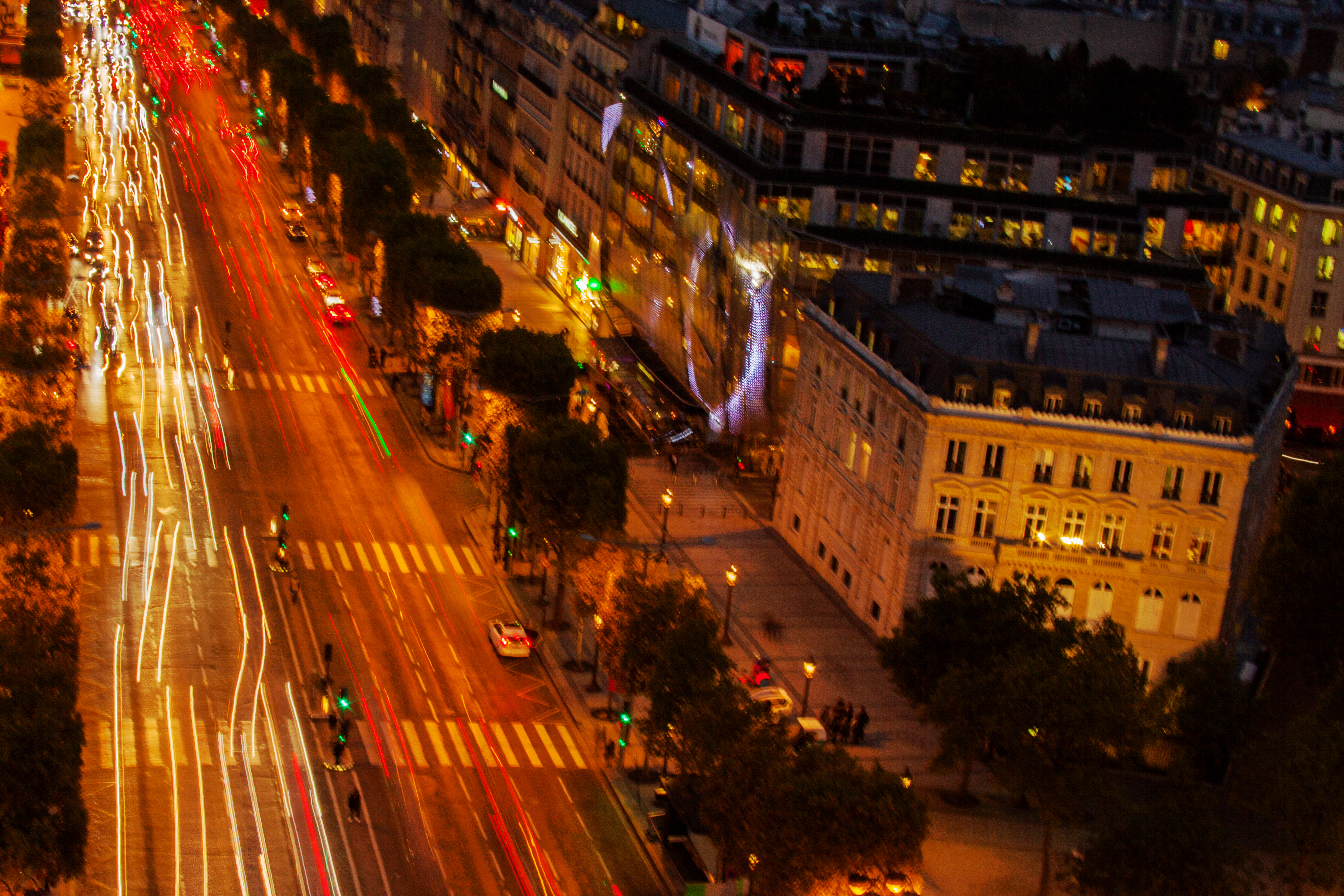 Car lights on Avenue des Champs-Élysées as seen from Arc de Triomphe