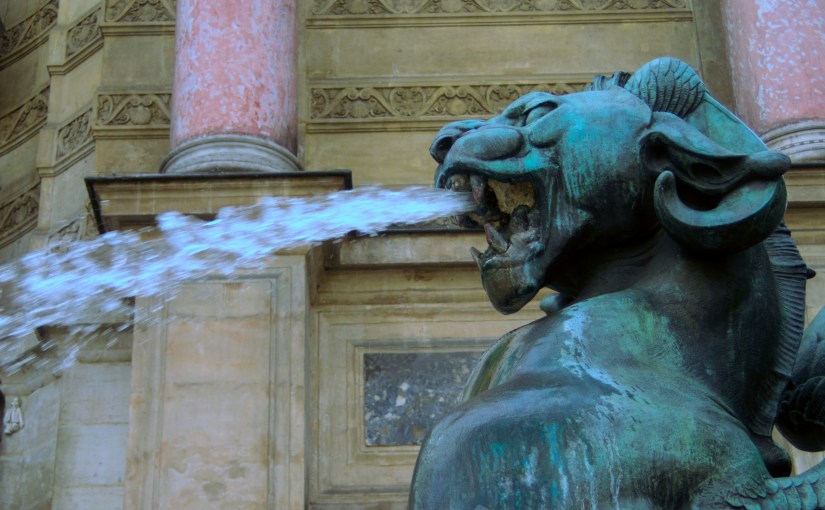 Beneath Michael, the water of the fountain spills into a basin at street level, with a winged dragon on each side.