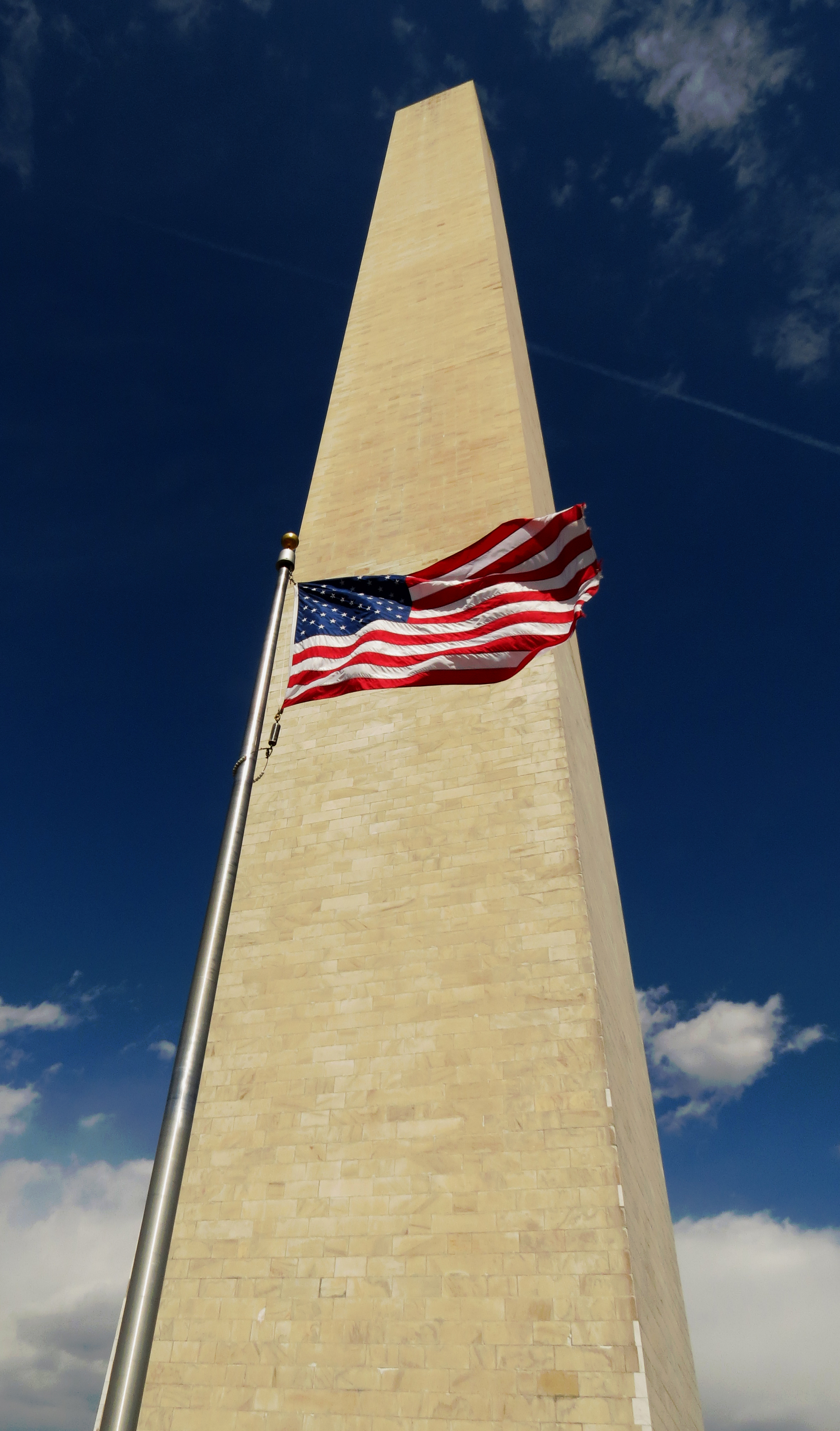 The United States flag in front of the Washington Monument