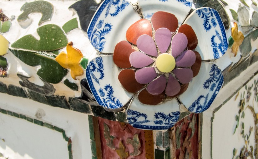 The floral decoration is created from seashells and recycled porcelain. The larger image below clearly shows re-purposed plates.