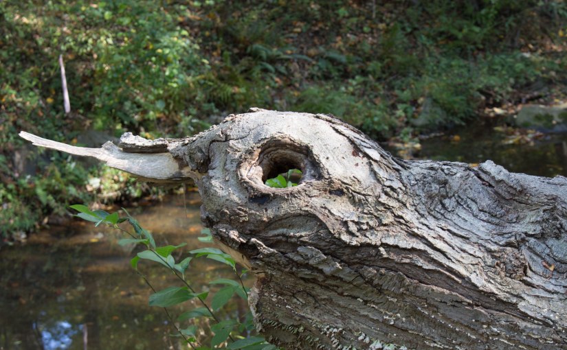 This photo was taken on October 23, 2016, in Green Spring Gardens, a public park in Alexandria, Virginia, with a Canon EOS Rebel SL1. Specs are ISO 100, f/8, 1/13 sec, 55 mm. This fallen tree appears to have the beak and eye of a large bird. The eye color is created by green leaves seen through a large knothole.