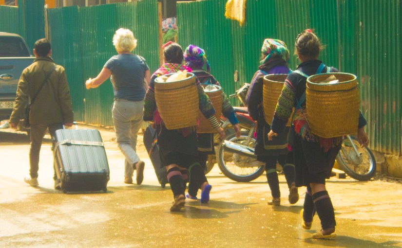 When visiting Sa Pa, Vietnam, it is impossible to avoid the basket-laden H’Mong tribal women, in packs of at least three, who hunt tourists. They lie in wait outside hotels, home stays, and bus stops. Each lady carries a tall basket on her back, filled with her wares. Tourists are warned not to buy from these women and even not to talk with them. If you feel you must speak, the only logical answer to them is “No.” They interpret everything else as “yes,” especially “maybe” and “later.” Even ” no” means “yes” because “no” means that they will increase their sales pressure until you give up and buy.