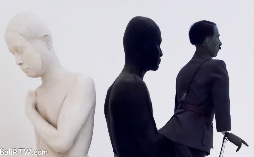 The main sculpture grouping, made of fiberglass, contains a life-sized black man holding an almost-life-sized puppet of Adolf Hitler in uniform. Directly behind him, facing in the opposite direction, is a life-sized white man. The two men appear identical physically, as well as in dress and demeanor; both are wearing a mask. In contrast to the pure black and white of the “humans,” the “skin” of the puppet is the ashen gray of death.