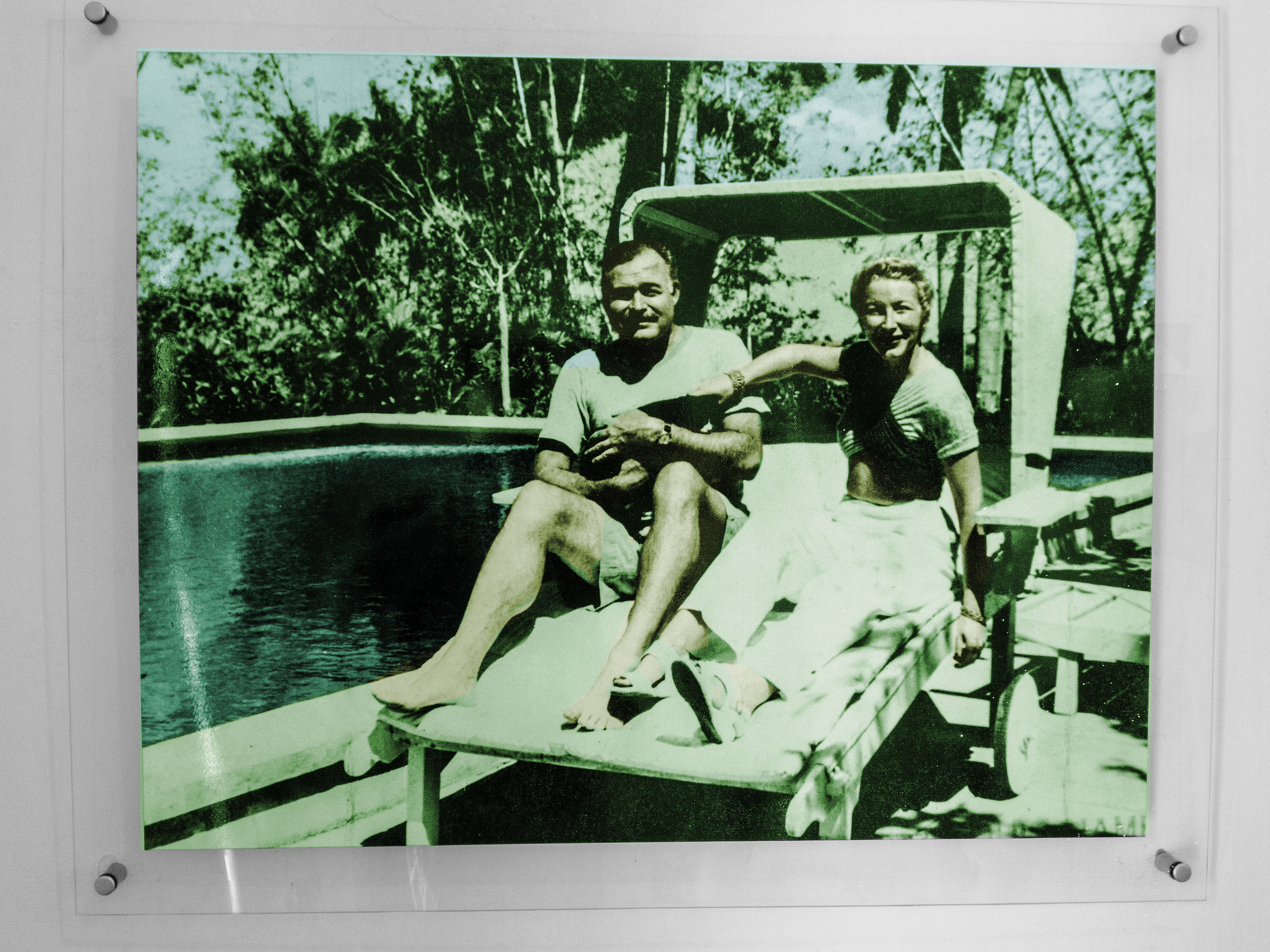 Ernest Hemingway, 4th wife Mary Walsh, and cat beside the pool